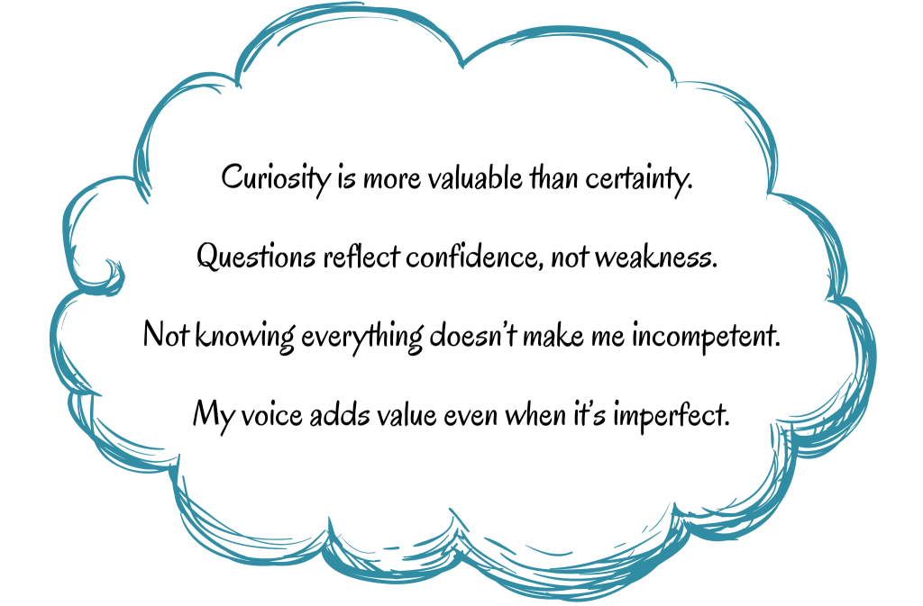 ✅Replace one self-doubt thought with a new truth (i.e., “I can add greater value by asking thoughtful questions or elevating others than proving how much I know.”)
